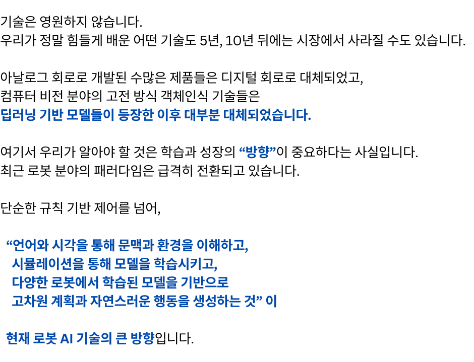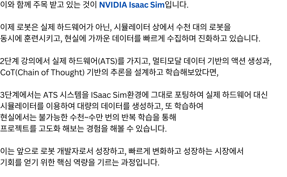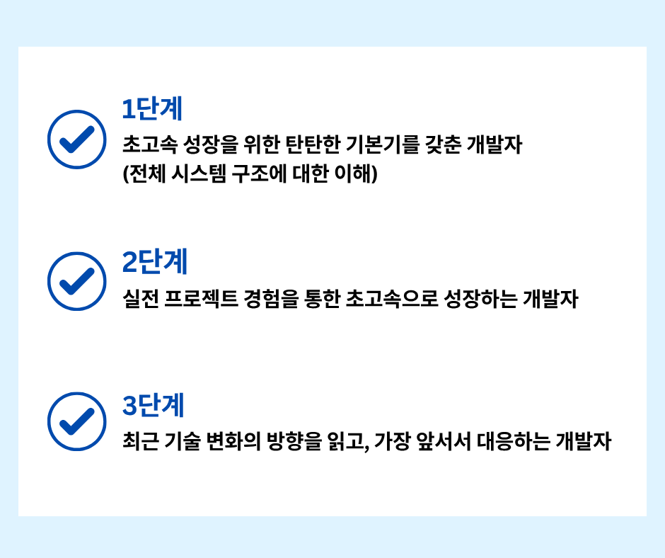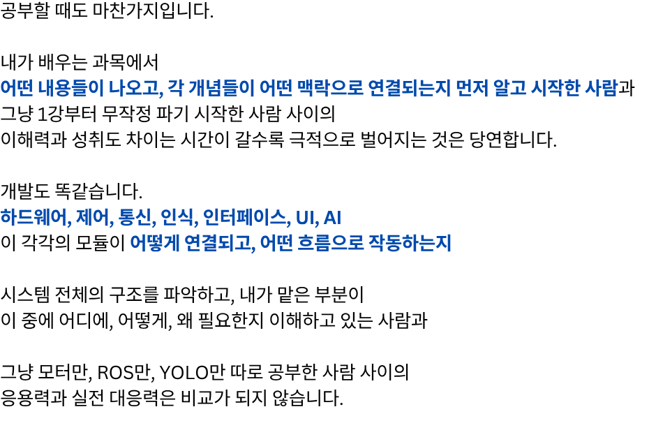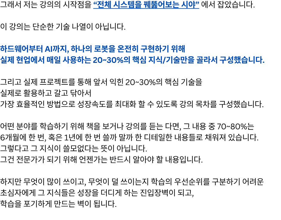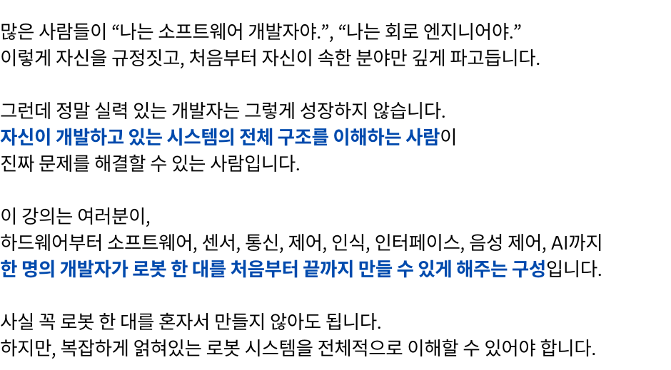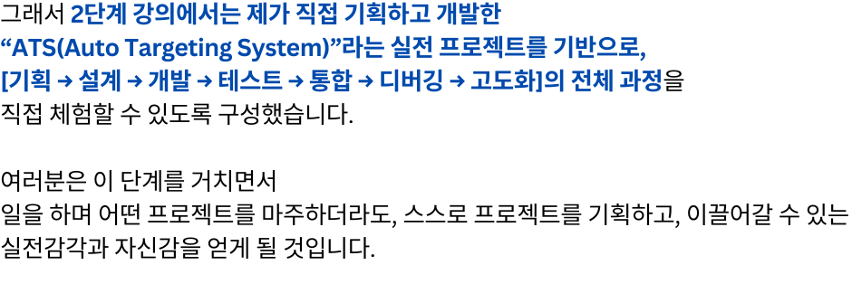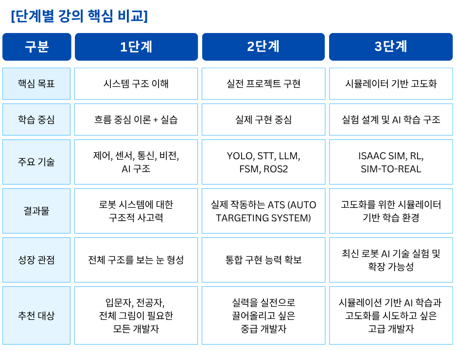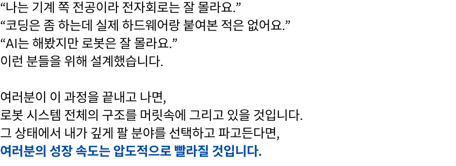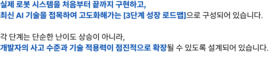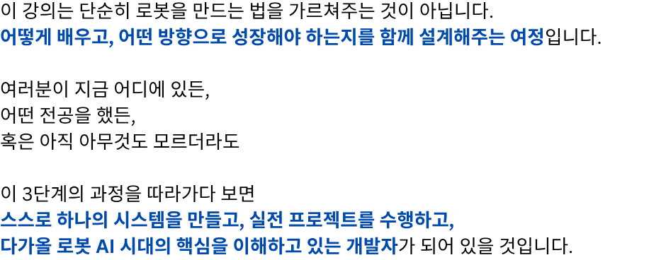 단계별 로봇개발자 성장 로드맵 1강 무료강의 바로가기 "여러분은 지금 어느 단계에 있으신가요?" 판매 강의 판매 중! 장바구니 1단계 – 전체 시스템을 이해하는 원맨 개발자 되기 (선착순 한정 특가) 129,000원 원래 가격: 129,000원.99,000원현재 가격: 99,000원. 더 보기 2단계 – 실전 프로젝트 수행으로 초고속 성장 (25년 4분기 공개예정) 169,000원 더 보기 3단계 – 변화의 방향을 읽고 리딩 가능한 개발자로 성장 (25년 4분기 공개예정) 169,000원 1단계 강의 "선착순 100명 한정 특가" 바로가기 "진짜 빠르게 성장하는 사람은 [전체 구조]를 먼저 이해합니다." "전체 강의는 총 [3단계]로 구성되어 있습니다." [ATS 블록다이어그램] 자주묻는 질문 강의 수강 기한은 어떻게 되나요? 강의 수강 기한은 결제일로부터 6개월입니다. 결제 기간 내 수강횟수는 무제한인가요? 네, 기간 내 수강횟수는 무제한입니다. 쿠폰은 어떻게 사용할 수 있나요? 결제시 쿠폰 코드를 입력해주세요. 환불방법이 궁금합니다. 결제하신 수업이 시작 전에는 환불신청이 가능합니다.수업이 시작한 뒤에는 환불규정에 따라 진행됩니다. 비밀번호를 잊어버렸어요. 로그인 페이지에서 비밀번호 찾기를 사용해보세요.